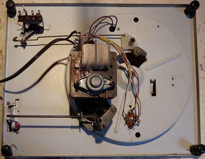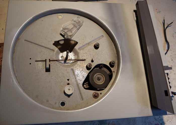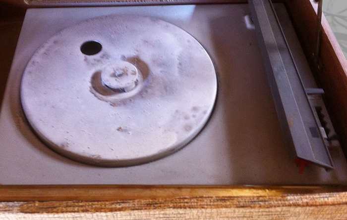 sous le plateau une mécanique minimaliste ; et un bras de lecture, d'une