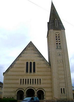 La petite ville d'Aunay-sur-Odon a été totalement détruite par les bombardements de juin 1944. A la fin des hostilités il ne restait que le clocher de l'église : il fallut l'abattre parce qu'il était trop endommagé .Il fut cependant possible de sauver les trois cloches en les déposant. Par la suite elles ont pris place dans le nouveau clocher avec, en plus, un bourdon de 2000 kg. La nouvelle église est de style néo-roman. La façade est agrémentée d'un bel appareillage de pierres qui en atténue la monotonie. L'abside, semi-circulaire, repose sur tout un ensemble de piliers. Un cloître attenant sur le côté droit de l'édifice complète l'ensemble.. Les vitraux de la nef représentent des saints régionaux. Lors de la consécration de l'église en 1952, il n'y avait qu'un petit orgue. Par la suite, un autre instrument de trente-trois jeux sur trois claviers construit par Jacquot-Lavergne, prit place à la tribune. Il fut inauguré à la Pentecôte 1957 par Marcel Dupré.FC.
