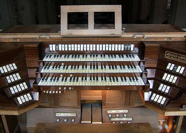 manuels de 61 notes, pédalier de 32 notes Au dessus des claviers : Tirasses