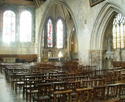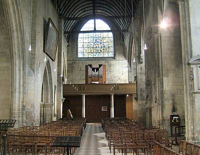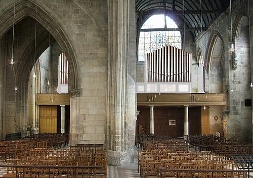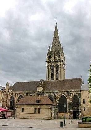 Avec Saint-Pierre et Saint-Jean, c'est une des plus anciennes paroisses de Caen . L'histoire de cette église est assez compliquée, son architecture aussi. On peut en dire autant de ses orgues. En réalité, son nom d'origine, c'est « Notre-Dame de Froide-Rue » : la rue Froide, sur laquelle s'ouvre l'église. En ce temps-là, il y avait aussi l'église Saint-Sauveur, à deux cents mètres de distance, donnant sur la place du Marché. Elle est devenue « le vieux Saint-Sauveur » lorsqu'elle fut désaffectée à la Révolution. Son titre de Saint-Sauveur passa alors à Notre-Dame de Froide-Rue, laquelle donna le sien (Notre-Dame) à l'église des Jésuites devenue paroissiale. Curieuse église que Saint-Sauveur, remaniée cent fois pour aboutir à ce que nous voyons aujourd'hui. D'abord une église romane dont il ne reste rien. Puis une nef avec un clocher latéral au XIVème siècle. Une deuxième nef adjointe au XVème de part et d'autre du clocher, communiquant avec la première par une audacieuse arcade. Ensuite deux absides pour complèter l'ensemble, l'une au XVème, l'autre au XVIème siècle. Et sur le tout, des voûtes en bois agrémentées par endroits de blasons sculptés. On peut apercevoir dans l'église telle qu'elle se présente aujourd'hui les traces de seize portes, fenêtres ou arcades murées ... Le clocher est magnifique, son seul « défaut » est d'être à cent mètres de celui de Saint-Pierre encore plus beau. FC.