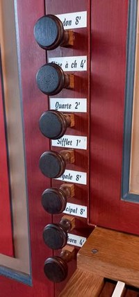 Deuxième clavier : Bourdon 8 * Flûte à cheminée 4 Quarte 2 Sifflet 1 Régale 8