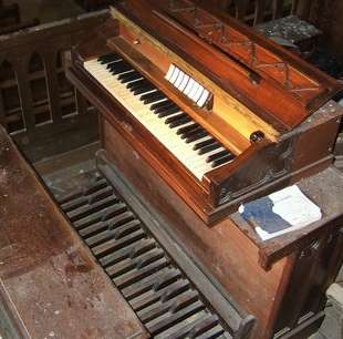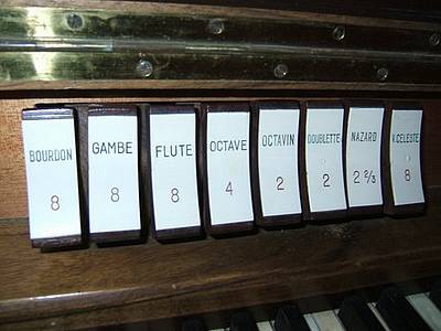 Clavier (56 notes) : Bourdon 8 Gambe 8 Flûte 8 Octave 4 Octavin 2 Doublette 2 Nasard 2 2/3 Voix céleste 8
