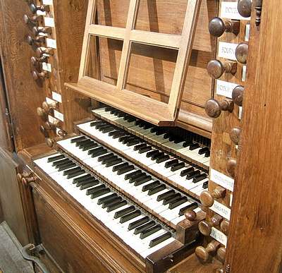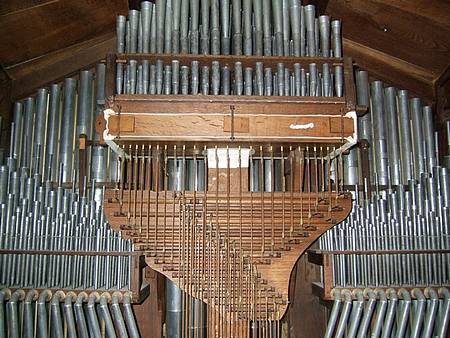 Positif 50 notes : Bourdon 8 Dessus de Flûte 8 Prestant 4 Flûte 4 Nasard 2 2/3 Tierce 1 3/5 Larigot 1 1/3 Fourniture Cimballe Cromorne 8