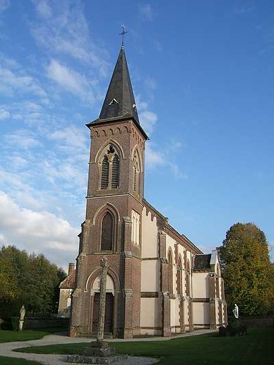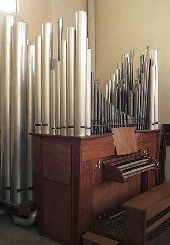 Hermival-les-Vaux ! Avec un nom pareil, on peut imaginer un paysage superbe ! C'est en effet dans un site agréable comme on en voit souvent dans le Pays d'Auge que se niche la commune d'Hermival-les-Vaux, tout à côté de Lisieux. On aperçoit d'emblée un château intéressant datant des XVI-XVIIèmes siècles, auprès duquel l'église paroissiale, très remaniée au XIXème siècle fait un peu figure de parent pauvre. Pourtant, dès qu'on y pénètre, on la sent « habitée ». On doit cette impression à la présence de la Communauté des Béatitudes qui habite le château et qui célèbre chaque jour l'office et l'Eucharistie dans l'église. Il s'y trouve des tapis sur le sol et des icônes un peu partout, c'est inhabituel... A droite de l'autel du transept, deux instruments. Le premier qu'on aperçoit, sur le côté de la nef est un « orgue » électronique de dimensions modestes. Tout à côté, dans le renfoncement du transept, un orgue, un vrai, qui ne laisse pas d'étonner. C'est un instrument de Pierre Chéron Les tuyaux de la soubasse (en aluminium) ajoutée après coup sont un peu disgracieux... FC.