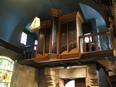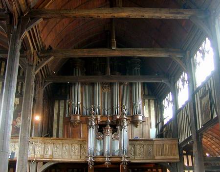 Il y avait jadis quatre églises à Honfleur. Dans « l'Enclos », centre du très ancien Honfleur protégé par des remparts, la première, l'église Notre-Dame, non loin des greniers à sel, a été supprimée vers 1820 en raison de son mauvais état et par nécessité d'urbanisme. Des trois qui restent, Saint-Etienne, la plus ancienne (XIVème siècle) , au bord du vieux bassin, est devenue musée. La plus connue, Sainte-Catherine (XVème siècle), tout en bois, attire nombre de visiteurs, étonnés souvent par son clocher situé à 20 mètres devant l'entrée. Et il y a Saint-Léonard, moins proche du célèbre port, moins visitée et pourtant intéressante. Un premier édifice fut détruit pendant la guerre de Cent ans et rebâti au XVème siècle, Ce deuxième édifice fut incendié en 1562 par les Huguenots. L'église a été reconstruite - en pierre - au XVIIème siècle, mais on lui a gardé la façade du XVème siècle qui fut surmontée d'un clocher octogonal au XVIIIème siècle. L'intérieur conserve de très belles pièces, comme le lutrin en cuivre venu de Villedieu-les-Poêles en 1791, quelques statues en bois, dont celle de saint Léonard, et des peintures murales du XIXème siècle . En 1854, Ducroquet construisit à la tribune un premier orgue de 12 jeux qui fut porté à 17 jeux en 1876. En 1878, Merklin construisit, dans le buffet de Ducroquet agrandi pour la circonstance, un nouvel instrument qui ne dura que vingt ans. En 1901 Charles Mutin a construit le troisième orgue qui est toujours en place. Relevé en 1981 par Jean-François Dupont, cet orgue a été complètement restauré à l'identique en 1993 par Nicolas Toussaint de Nantes. Mais en 2006, la transformation du chauffage et ensuite la réfection de la voûte ont fait souffrir l'orgue, actuellement muet dans l'attente d'une nouvelle intervention du Facteur... FC.