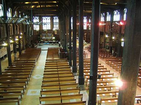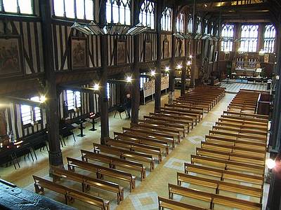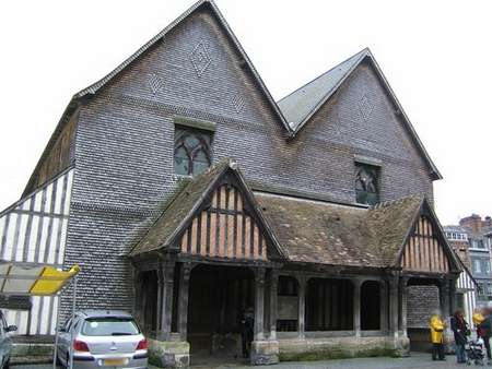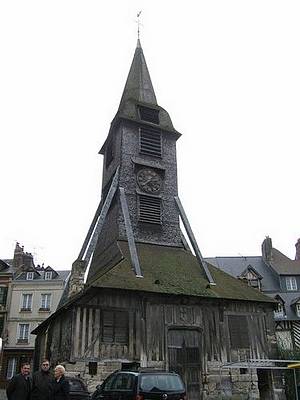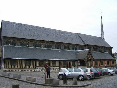 Honfleur est célèbre à plus d'un titre. Le site, entouré de collines toujours vertes d'où on découvre des panoramas toujours variés, l'estuaire de la Seine, le Vieux Bassin, les pêcheurs au retour de la marée, les maisons anciennes, les musées, les galeries d'art et les peintres sur les quais attirent en toutes saisons de nombreux visiteurs . L'église Sainte-Catherine tout près du port, intrigue peut-être encore davantage. Elle est originale cette église tout en bois comme les vieilles maisons du Pays d'Auge, avec ses deux nefs égales, et son clocher isolé, en bois lui aussi, soutenu par huit grandes béquilles et dont la base était jadis la maison du sonneur. Pourquoi cette église ? La guerre de Cent ans et les destructions qu'elle a causées, la nécessité de reconstruire rapidement, pas de pierre dans la région mais du bois autant qu'il en fallait : voilà comment les honfleurais se sont débrouillés provisoirement ... et admirablement. En pénétrant dans l'église, le charme continue : les piliers massifs en bois, une charpente solide pour les voûtes en bois, les statues en bois, les autels en bois.
