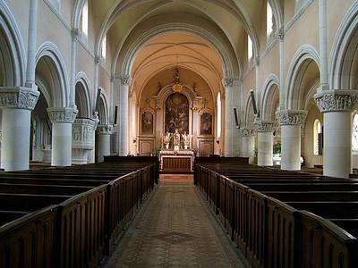 Orgue Eglise Sainte-Anne La commune de Moult existe un peu dans l'orbite de sa voisine, Argences, comme si les deux n'en faisaient qu'une, ce qui n'est pas le cas. C'est pourtant sur le territoire de Moult que se trouve encore l'ancienne gare de la Tuilerie d'Argences. Qand on ne connaît pas la commune, il faut chercher un peu l'église dont le clocher n'émerge guère au dessus des toitures environnantes. Cette petite église n'a rien d'extraordinaire. Elle a pourtant un chœur roman inscrit à l'inventaire des Monuments historiques, avec un autel et son retable et quelques pièces de mobilier du XVIIIème siècle. On est surpris de voir une petite tribune avec un orgue qui, d'un peu loin, présente une assez belle apparence. Pour y accéder, il faut emprunter un escalier extrèmement étroit aménagé en spirale dans l'intérieur d'une pile du clocher. On constate alors que l'apparence est trompeuse. Tous les tuyaux de façade sont en bois peint de couleur aluminium. Et derrière cette façade, l'orgue est dans un état de délabrement complet. Son histoire est très obscure. Il aurait été construit à la fin du XIXème siècle à partir de quelques éléménts du XVIIIème. Un tuyau comporte cette inscription gravée maladroitement : « L'an 1860 j'ai été fait par . . . Langlois facteur d'orgue à Bonnebos par Mr C. Auvergne Dt de Mault ». Ce qui reste du clavier permet de constater qu'il comportait 54 notes. Mais toutes les parties en bois de l'instrument tombent en poussière. Et ce qui reste de tuyaux est dans un complet désordre : tuyaux couchés, tuyaux tordus sans compter ceux qui ont disparu.Il y eut dans les dernières décennies des velléités de restauration dont aucune n'a abouti. Devant cet instrument en total état d'abandon, on ne peut s'empêcher de penser à l'orgue de l'église de Clarbec. Ce petit instrument de la fin du XVIIe siècle a été sauvé grâce au musée de Vire qui en a assuré la remise en état. Si quelque mécène pouvait en faire autant pour l'orgue de Moult…(c'est fait! voir plus bas...) D’après ce qui reste des inscriptions, on peut penser que la composition de l’orgue était la suivante : Bourdon 8 Prestant 4 Flûte Doublette (dessus) Doublette (basses) Plein-Jeu Doublette (dessus) Tierce (basses) Tierce (dessus) Nasard (basses) Nasard (dessus) Trompette (basses) Clairon Une découpe dans le bas de la boiserie sous le clavier semble indiquer l’existence d’un petit pédalier totalement disparu. FC