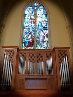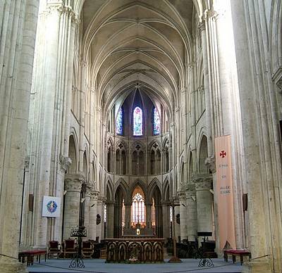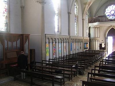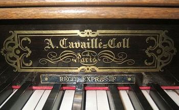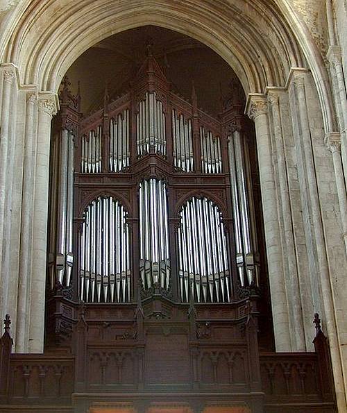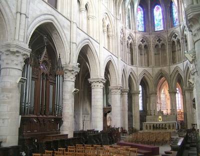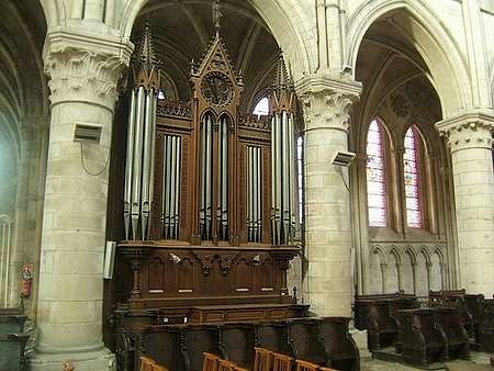La cathédrale Saint-Pierre est devenue église paroissiale lorsqu'ont été supprimées la petite église Saint-Martin et les maisons qui s'entassaient à l'entour afin de libérer une vaste place devant le parvis. C'était après la Révolution, au temps du Concordat. La tribune à l'extrémité ouest de la nef est occupée par le grand orgue Cavaillé-Coll. Mais si nous approchons de l'autel de la croisée du transept, nous apercevons le petit orgue, à gauche entre les deux premiers piliers du chœur. A voir son buffet, on ne peut soupçonner l'importance de cet instrument. Il ne comporte pas moins de 20 jeux réels, ce qui est assez rare pour un orgue de chœur. C'est aussi un excellent Cavaillé-Coll (Mutin ?) daté de 1907. FC