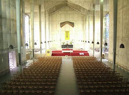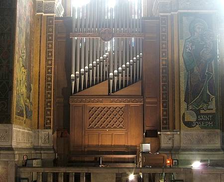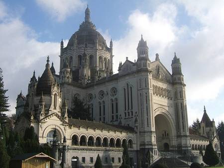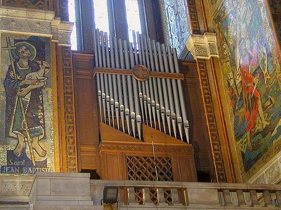 Le projet de construction d'une basilique dédiée à Sainte Thérèse après sa canonisation en 1925 suscita bien des oppositions à Lisieux même, notamment dans le clergé : n'y avait-il pas assez de belles églises dans la petite ville ? L'évêque passa outre, d'autant que le Pape Pie XI en personne demandait cette basilique. En 1929, les premiers travaux commençaient, et après l'inauguration de la crypte en1932, ce fut celle de la basilique en 1937, mais elle n'était pas vraiment terminée à la déclaration de la guerre en 1939. Elle fut épargnée par les bombardements de 1944, et les travaux reprirent aussitôt que la vie fut redevenue normale. En 1954, elle fut officiellement consacrée. Elle peut accueillir 4000 fidèles et reçoit chaque année deux millions de visiteurs. A l'extrémité de l'esplanade fut ensuite construit le campanile qui n'est pas achevé. Il abrite pourtant un magnifique carillon de 51 cloches, dont les cinq plus importantes et le bourdon de 9 tonnes sonnent en volée. Dès 1943, le Recteur de la Basilique se préoccupa de la doter d'un orgue. La Société Cavaillé-Coll disposait d'un instrument de 50 jeux sur trois claviers manuels. Son Directeur, Joseph Beuchet, l'avait construit pour tenter de remonter la Maison et il le présenta en 1936 à l'Exposition universelle de Bruxelles. Puis l'orgue fut remonté à Paris.C'est cet instrument qui fut proposé à Lisieux et le Recteur de la Basilique en fit l'acquisition. Mais en quel endroit de la Basilique allait-on l'installer ? L'architecte n'avait pas prévu d'emplacement assez vaste ! On fit appel à la Maison Gonzalez qui effectua une restauration complète. Et l'orgue qui compte maintenant 55 jeux finit par trouver place dans les tribunes situées de part et d'autre du choeur : à celle du sud, le GO, la pédale et la console, à celle du nord, le Positif et le Récit. C'est dire que les transmissions sont électriques. Mais 22 mètres séparent les deux parties, et l'acoustique est difficile avec 11 secondes de réverbération. FC