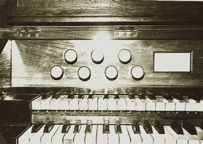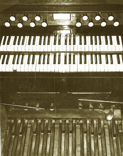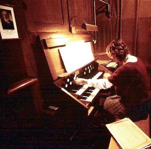 une organiste au travail, sous le regard de John (ou Eugène?) Abbey