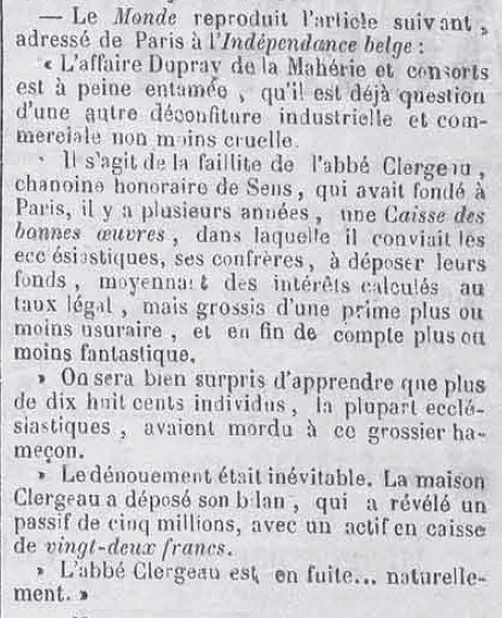 <<...Les déplacements et villégiatures sont plus que jamais à l'ordre du jour dans le monde de la finance et de la caisse. C'est d'abord l'abbé Clergeau, fondateur de la Caisse des Bonnes Oeuvres qui vient de partir, laissant un passif de cinq millions et un actif de vingt-deux francs. Puis le caissier d'un des principaux commerçants de Bordeaux. Puis encore le caissier d'un agent de change parisien. Disparus l'un et l'autre, en laissant vides les coffres de leurs patrons respectifs...>> JOURNAL DE LA SAVOIE DU 2 SEPTEMBRE 1866 (www.memoireetactualite.org)
