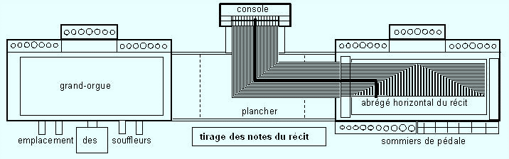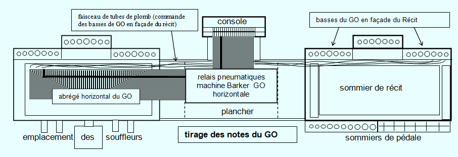 depuis la console, les vergettes passent sous le pédalier, puis sont renvoyées à angle droit vers le buffet de gauche, en passant sous le plancher qui relie les deux buffets