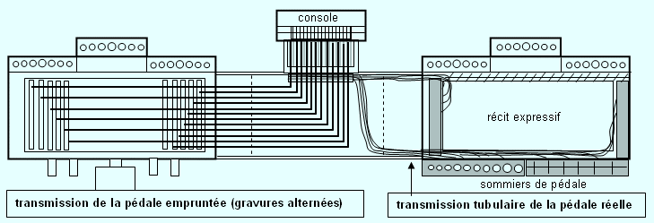 comme dans de nombreux instruments de ce type, la pédale empruntée est réalisée par un système de gravures intercalées, les registres permettant de faire parler les mêmes tuyaux au grand-orgue et à la pédale.