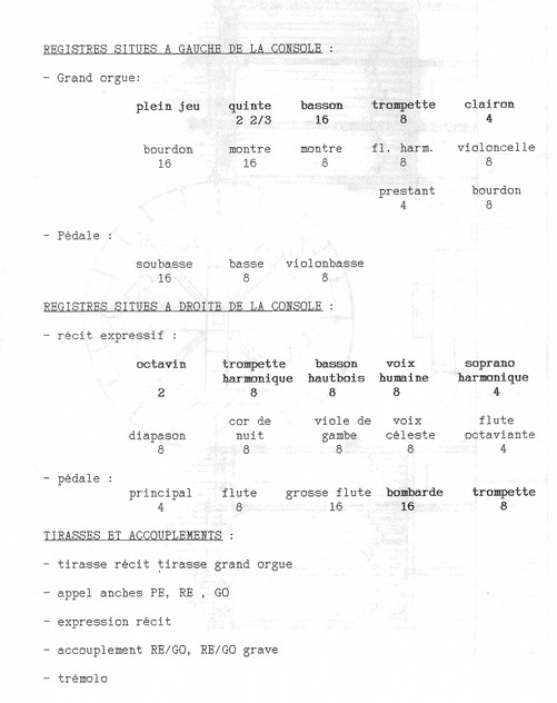 16, Soubasse 16, Flûte 8, Violoncelle 8, Flûte 4, Bombarde 16, Trompette 8.